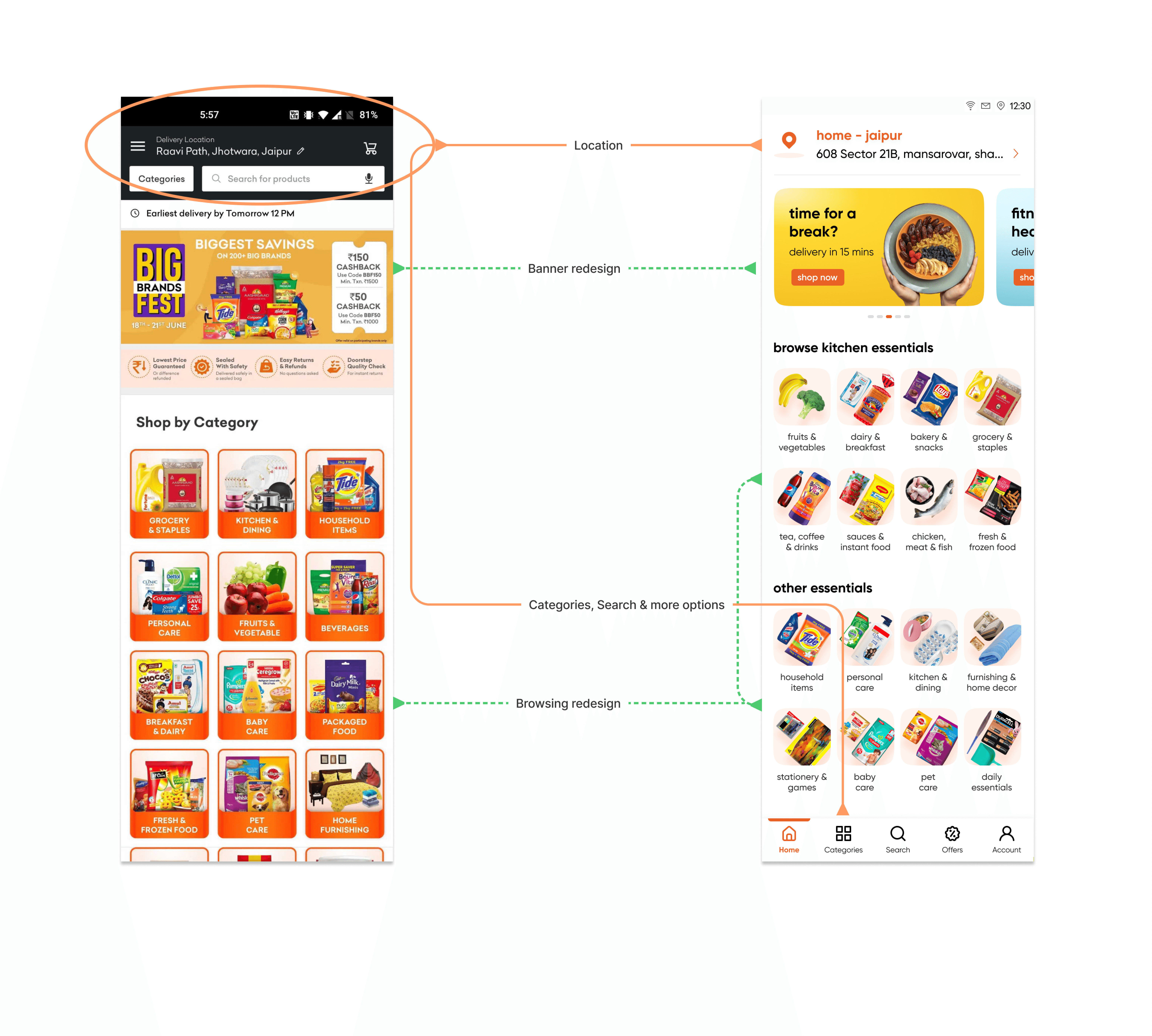 Delivering everything under 30 mins (or 15 mins as we aimed at) meant it was time to update the app experience to be in alignment with the proposition of Everything @ Express. I sat down with two Product Managers in our team to break it further down & define touch points in the user journey where we needed to make changes.