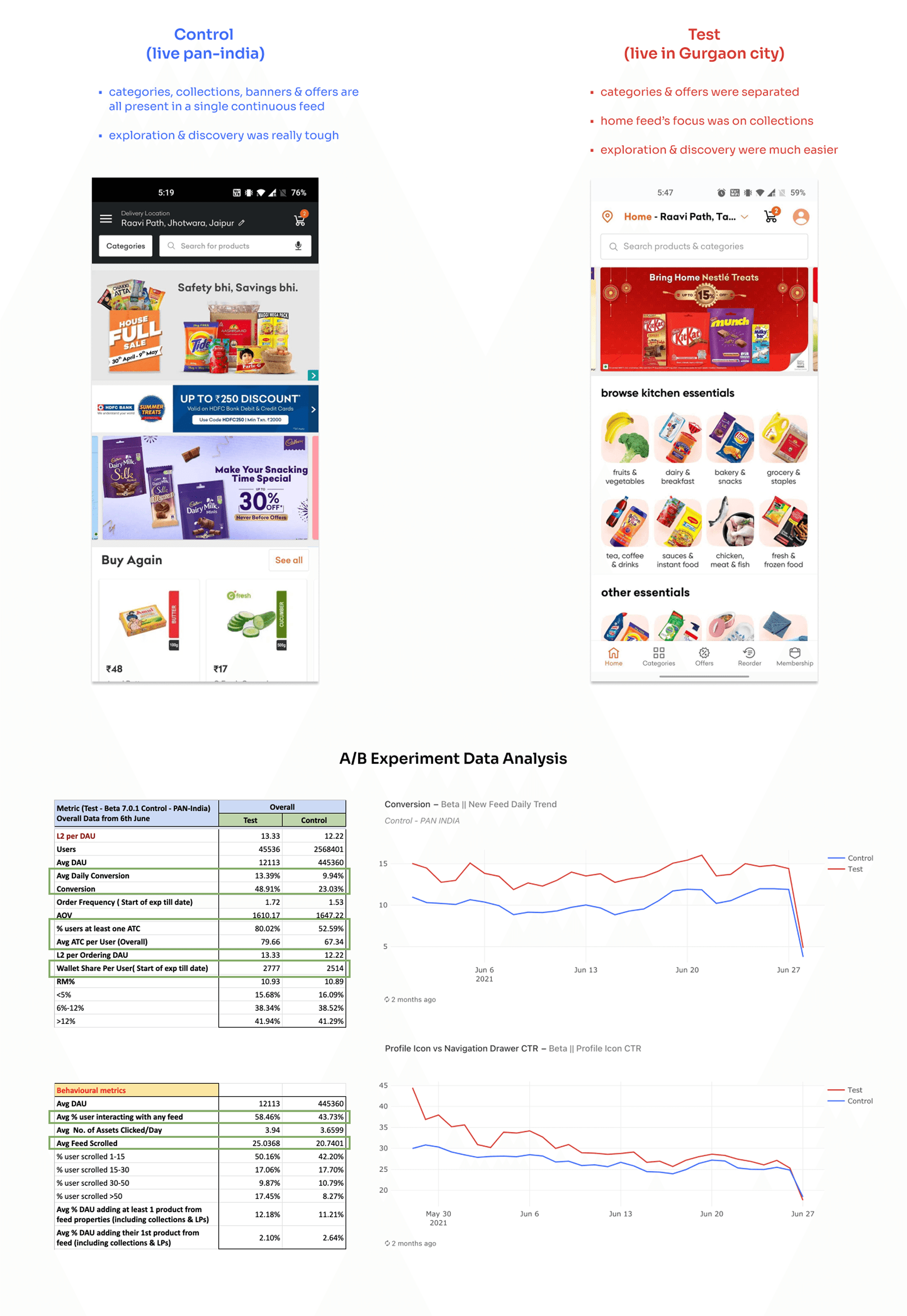 Users' interaction with the feed was 15% higher in the Test feed - exploration & discovery was easier hence, impulse purchasing was also observed resulting in a higher wallet share