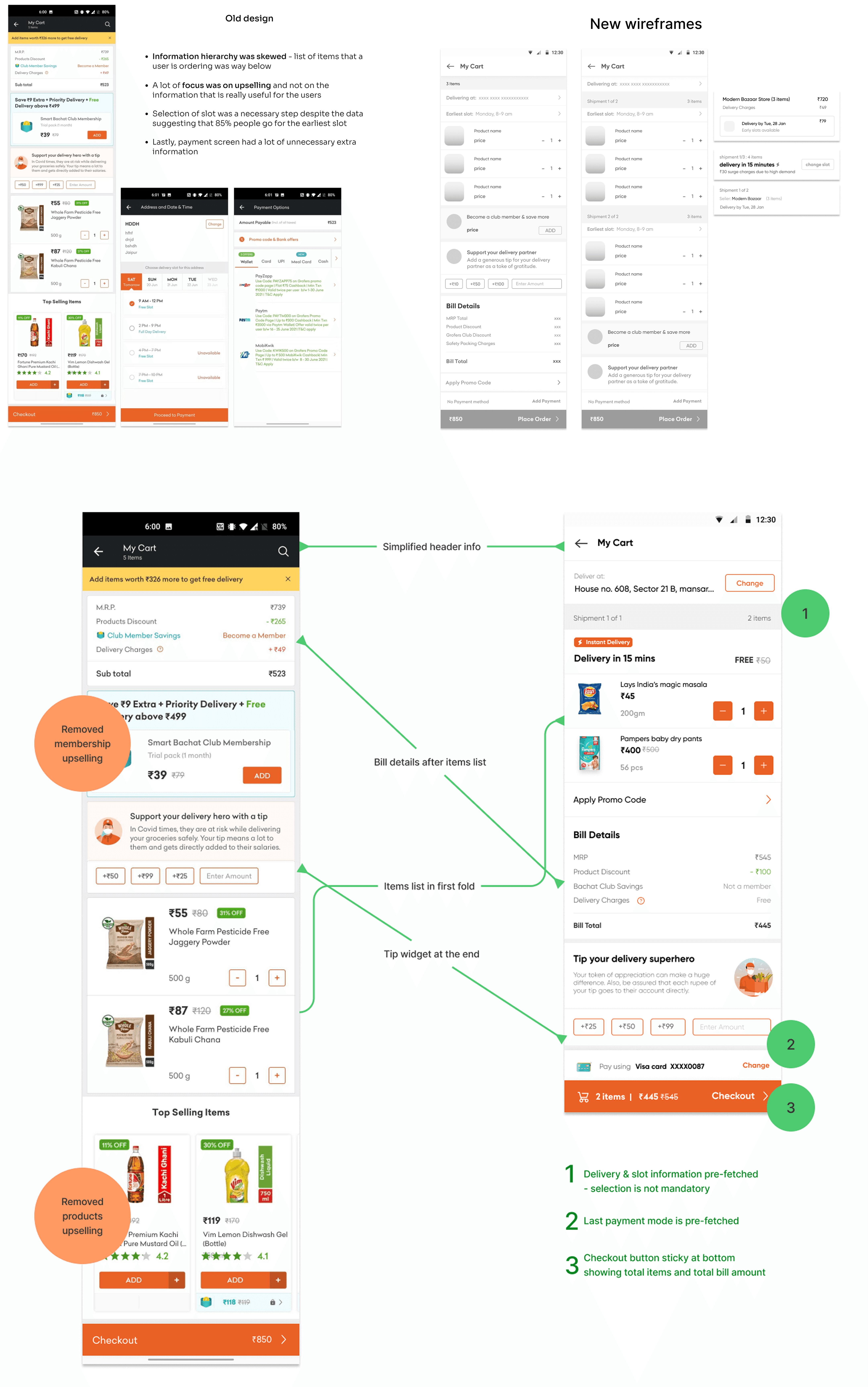 After making addition of items easier, the next step was to make checkout easier - which was a 3-step process in the earlier flow. We started off with the vision of making it a single-click checkout for repeat users. Wireframes focus areas - improving information hierarchy and reducing the number of steps