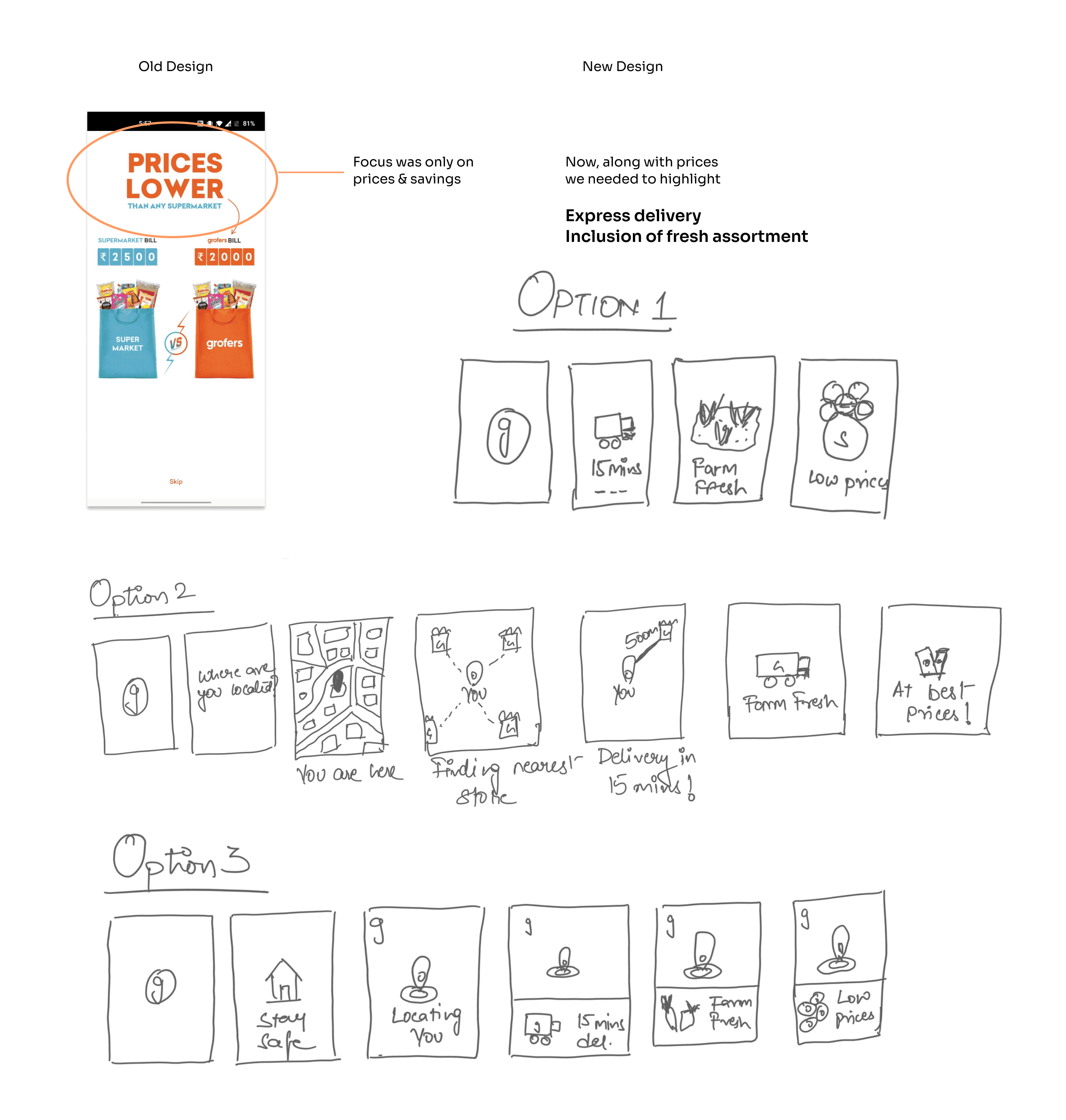 Grofers has always been positioned as a brand that helps customers save more with its guaranteed lowest prices. Now, to introduce our customers to the inclusion of a new and more exciting proposition of express delivery, I redesigned the onboarding flow.