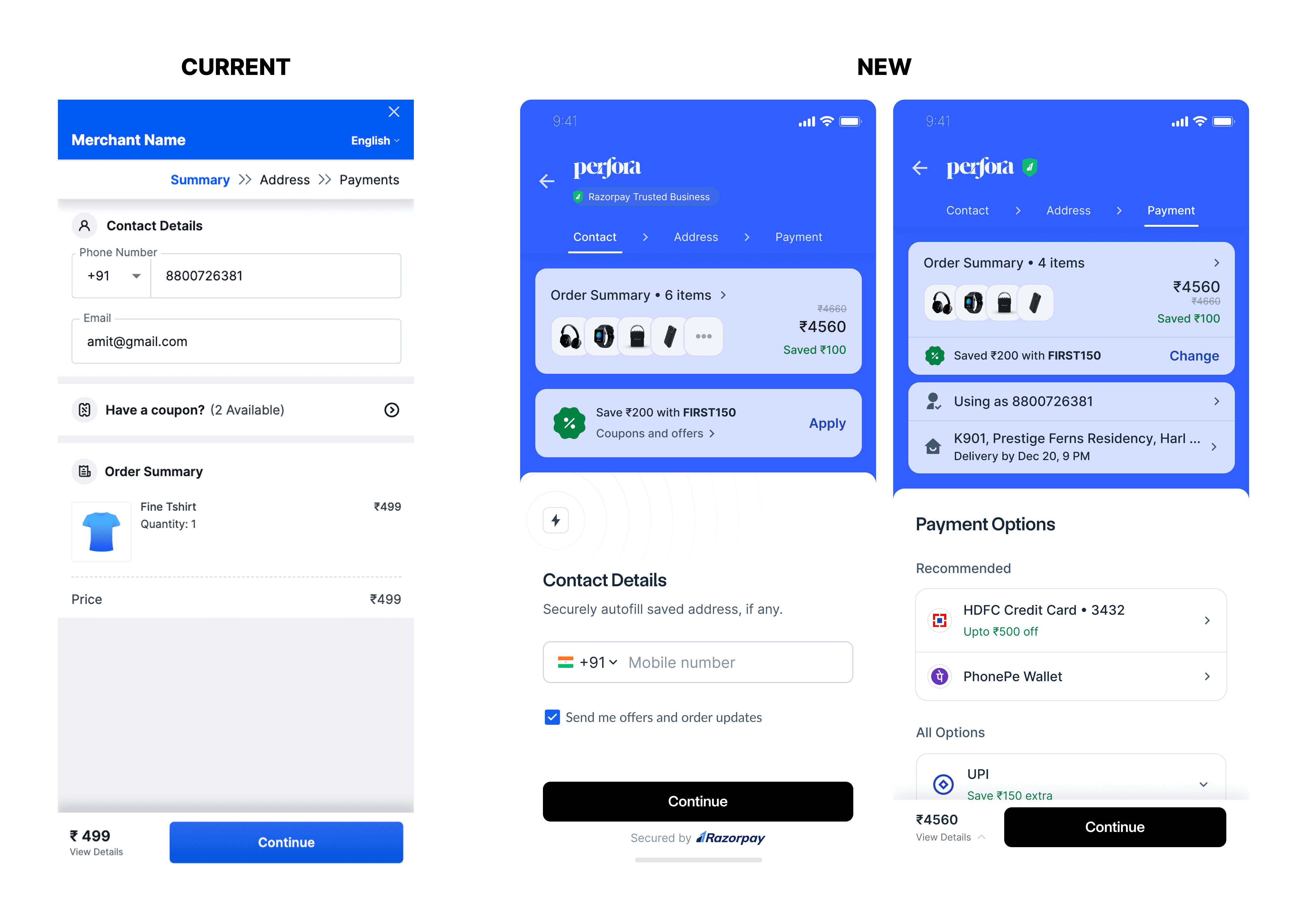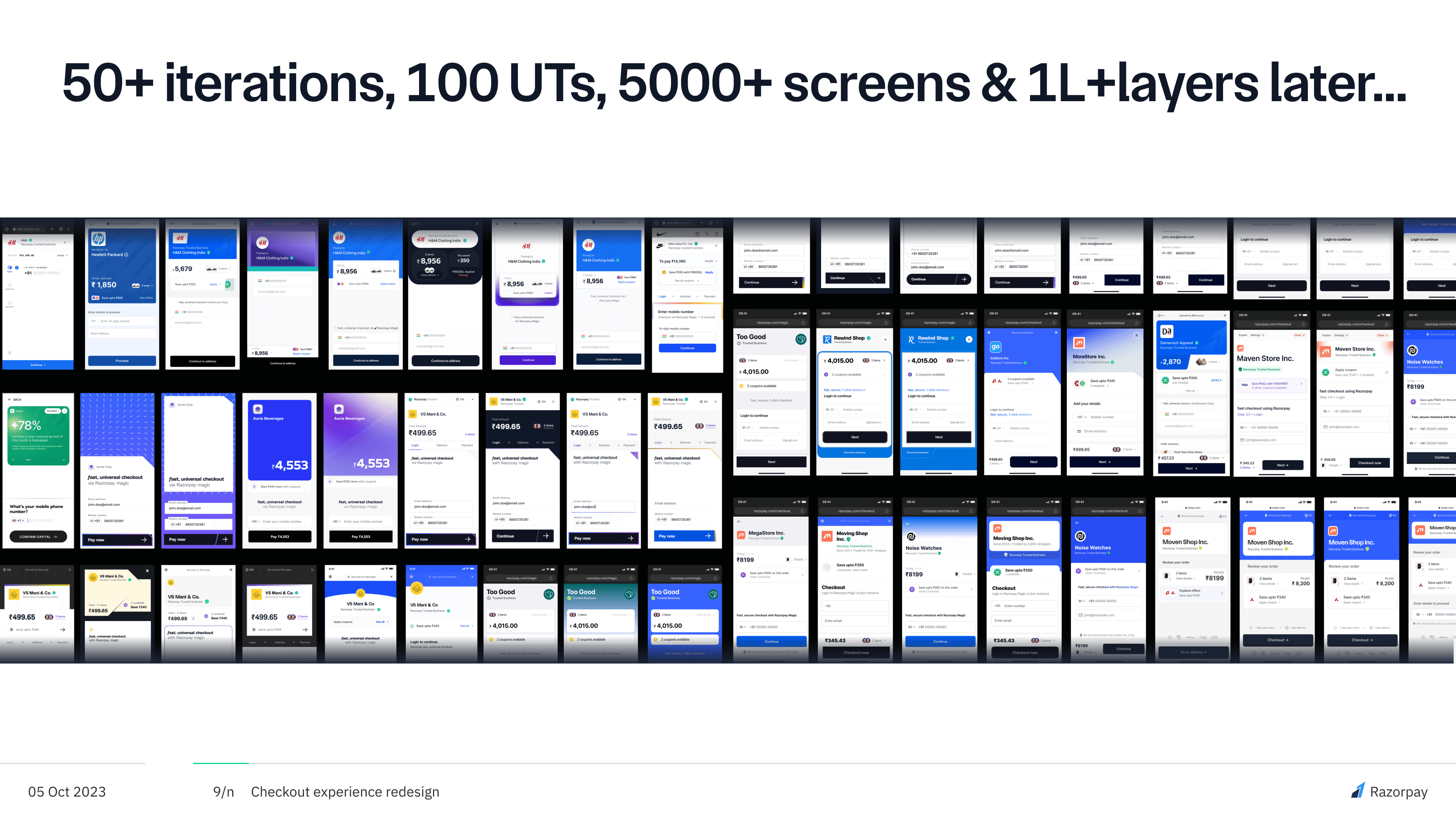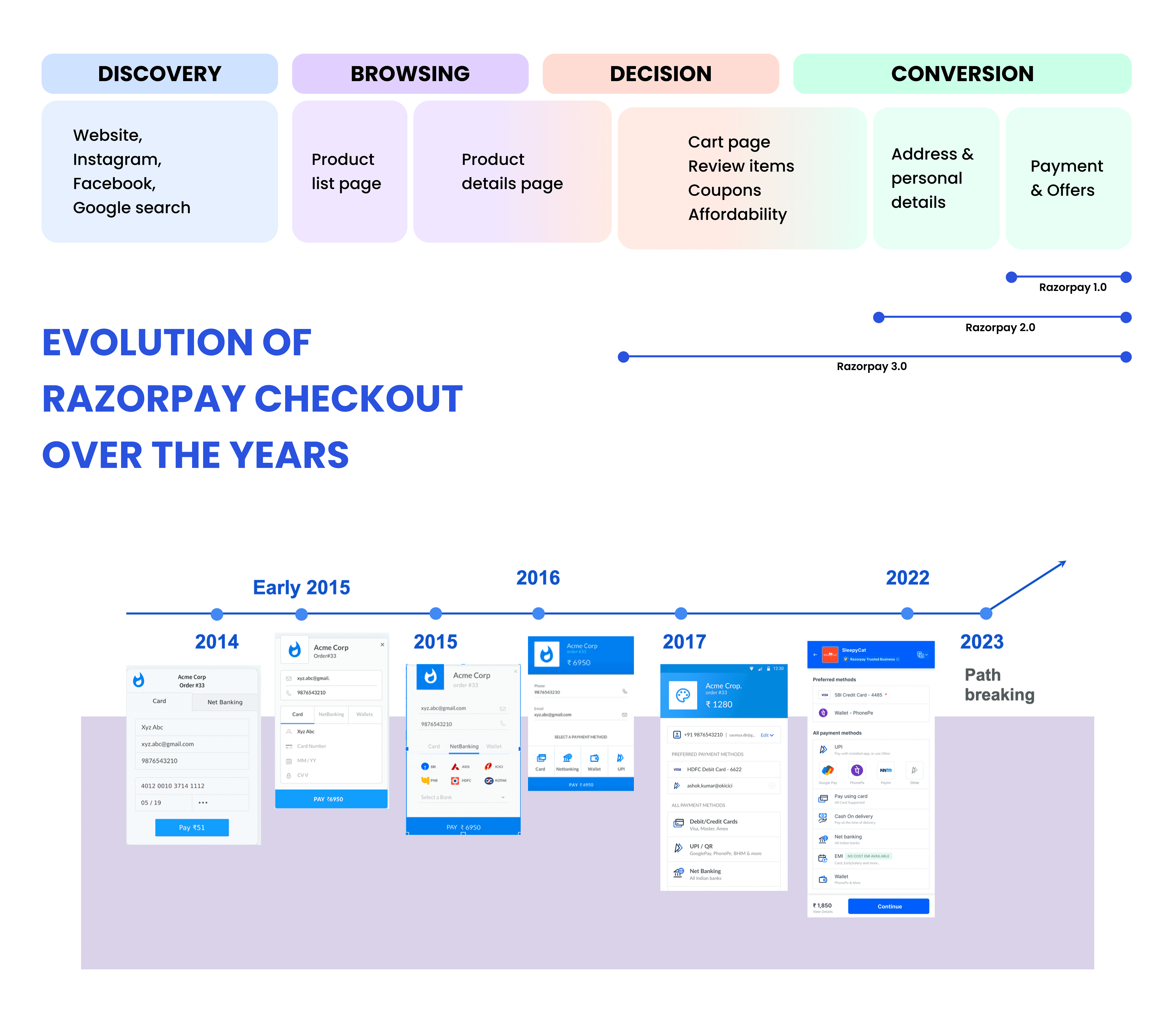Razorpay 1.0 was launched in 2014 and it was a simple checkout back then - a list of most common payment methods mainly Credit card, Debit card and Netbanking. But as the digital payments landscape grew, so did the complexity - focus shifted from cards to UPI first, more wallets, UPI apps, coupons, reward points etc. And at the same time the number of online buyers as well as their expectation to have simpler and faster checkouts grew too.