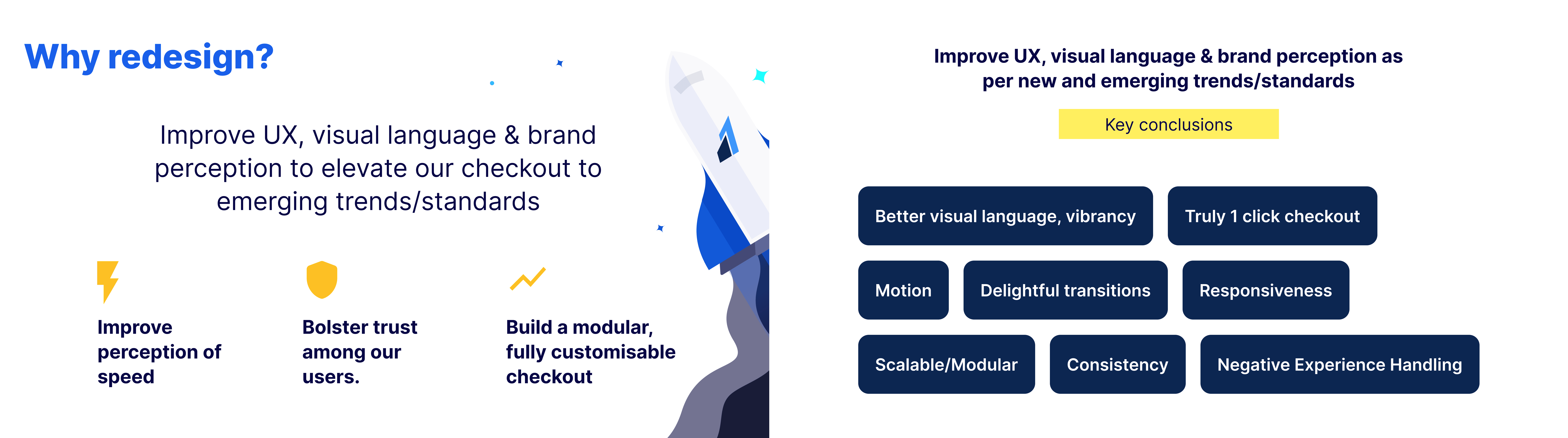 In today's evolved digital landscape, consumers want a fast and seamless purchase journey; merchants want a reliable, efficient and easy to integrate checkout. With this in mind, we redesigned the Razorpay checkout with focus on - SPEED (1-click checkout), winning TRUST for the first time visitors and building a COHESIVE purchase journey from start to end.